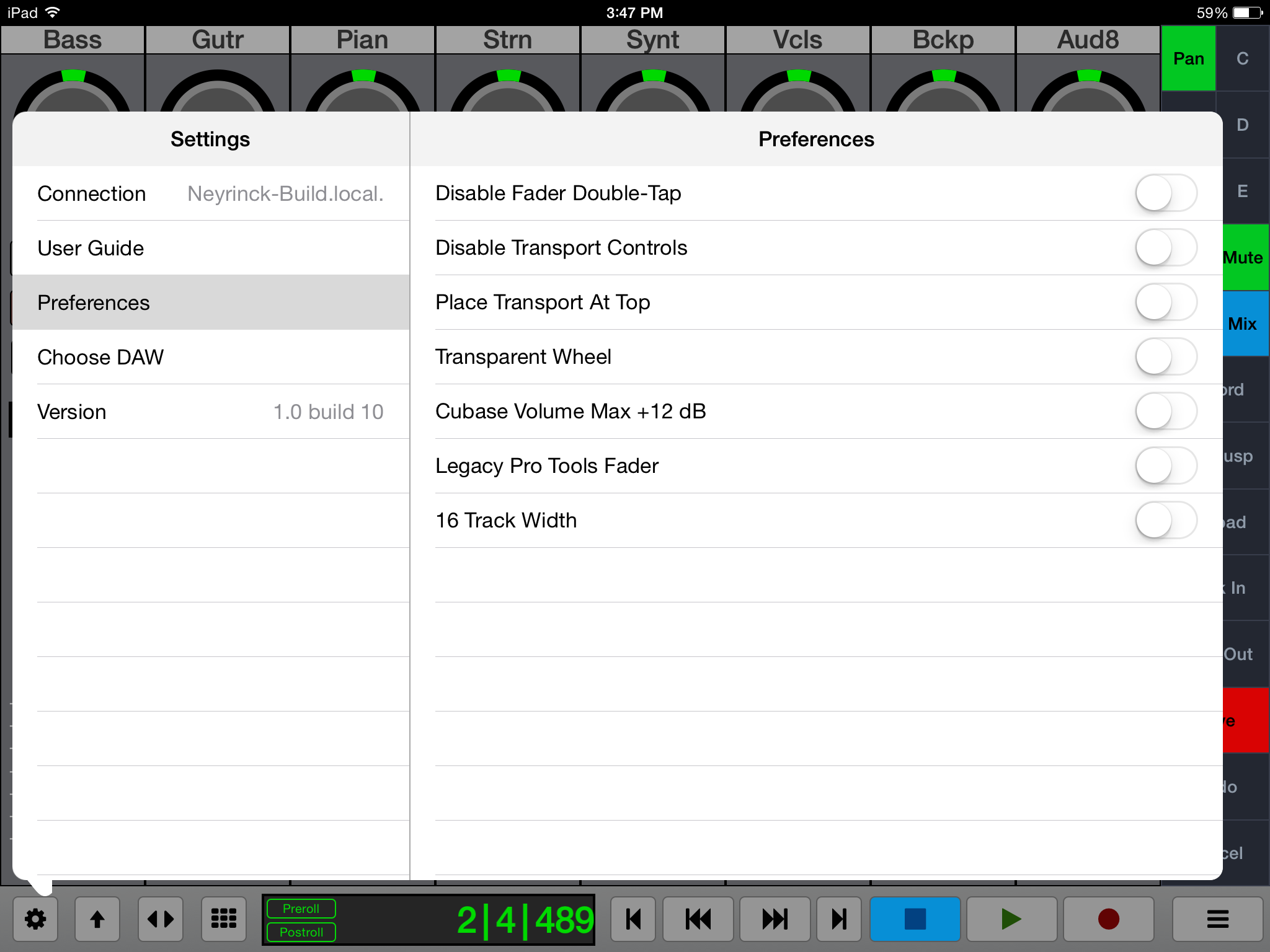 Back to top V-Console iPhone V-Console on the iPhone features a one track display with command buttons and transport control. Swipe left and right on the channel to navigate between tracks. Open the channel navigation pop-up to jump to a specific track by tapping on the track name.