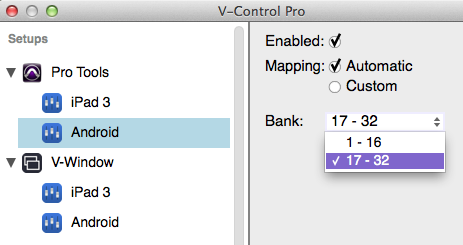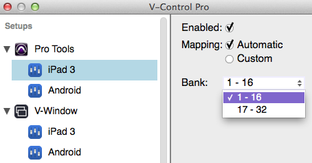 Launch V-Control Pro Launch V-Console on a device and connect it to computer Launch the DAW Click on the V-Control Pro icon in the task bar and select "Setups.." With the Setups window opened, select the controller linked with the DAW to display options for that controller Click on the Bank drop down window to select which bank to use: Here's how it would be setup for two controllers in 16 track mode.